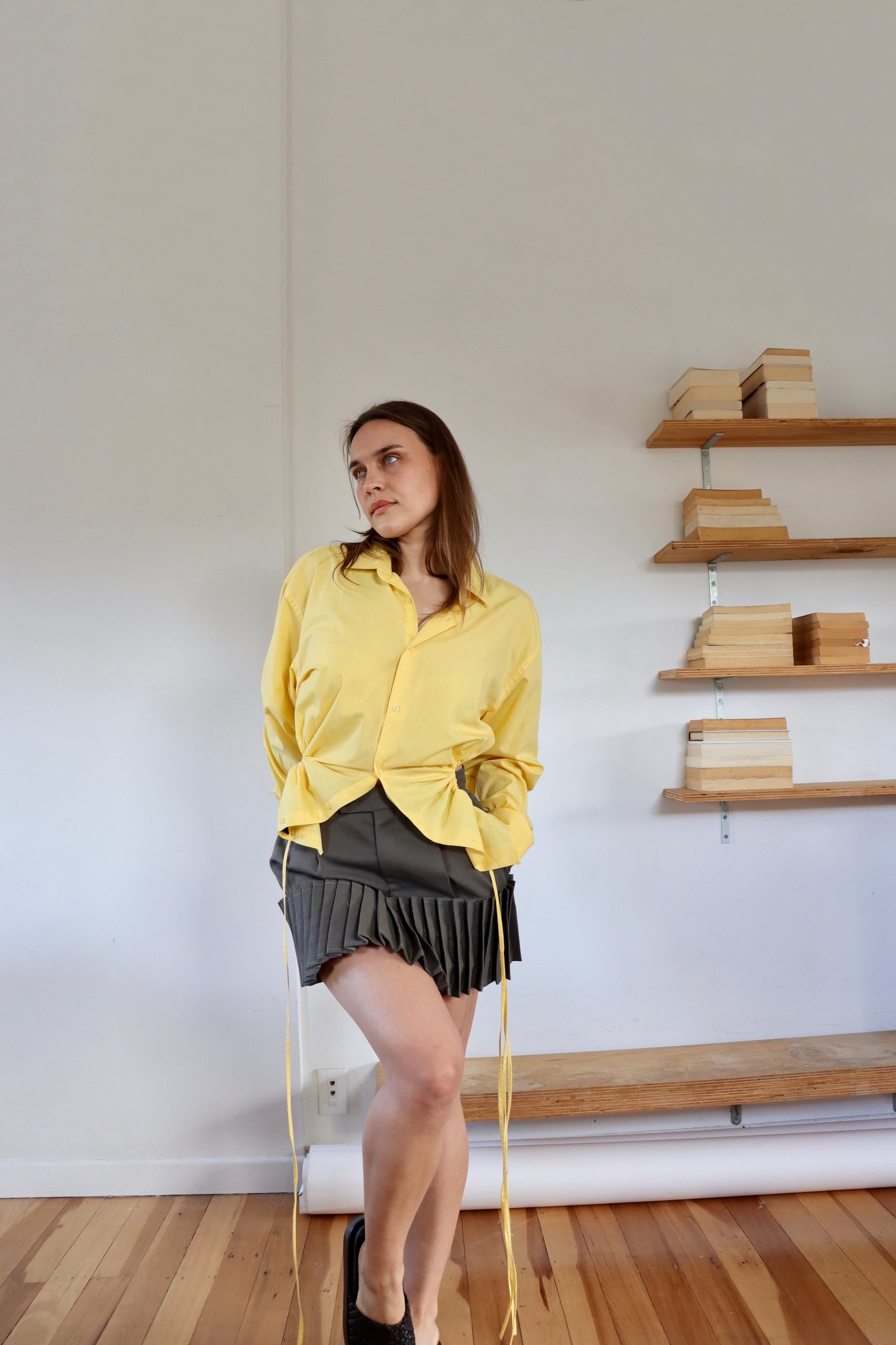 The Curve Shirt features a gathered cutout on each side, creating a flattering cropped silhouette through the waistline. The cutouts can be loosened and tightened using the ties, giving the wearer freedom to adjust the sizing how they see fit.
